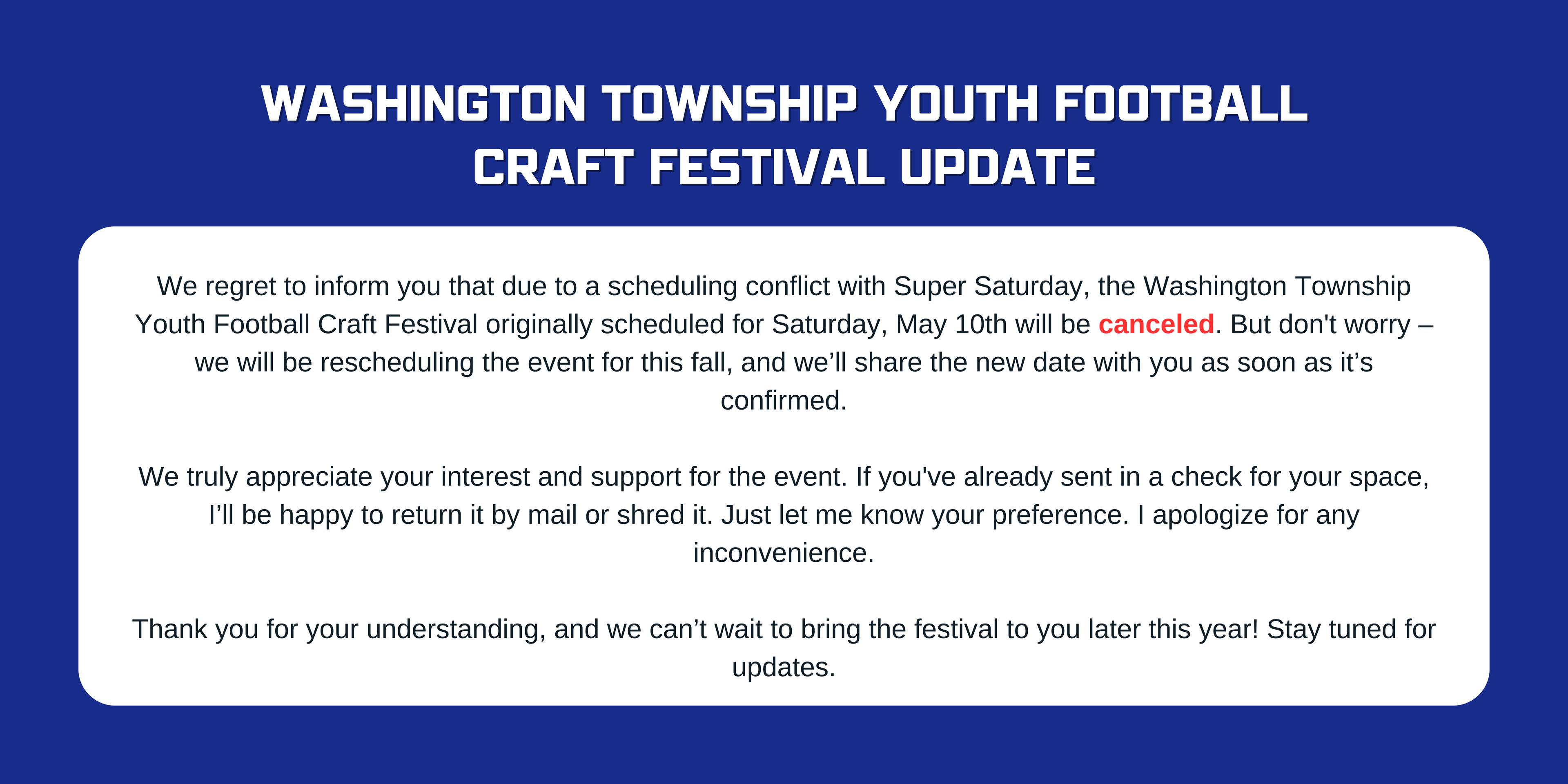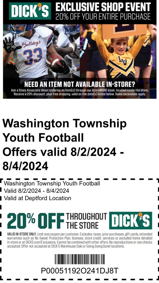 Learn MoreAny incoming Freshman student in the Washington Township School District interested in playing football in the fall, please fill out the contact information! Due to the closing of school, we will not be able to meet in person until restrictions are uplifted! I'm looking forward to the Fall and getting a chance to work with the Class of 2025!