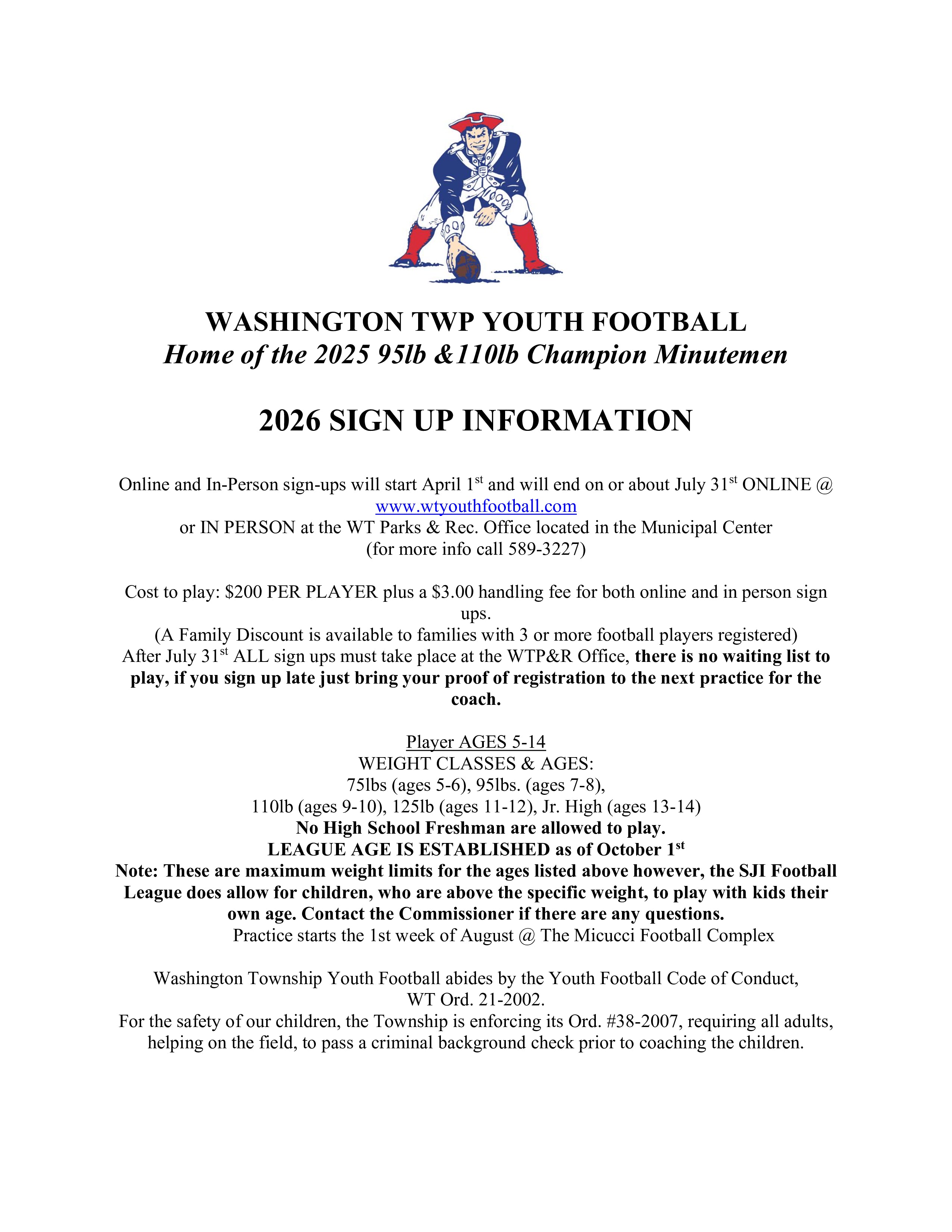 Due to parents not returning the issued equipment, the WTYFB has no choice but to impose a $50 rental fee on all issued equipment including game pants and game belts. The $50 is due at equipment handouts in July. Your deposit will be returned when the equipment is returned at the end of the season. Cash/Debit card or check will be accepted.